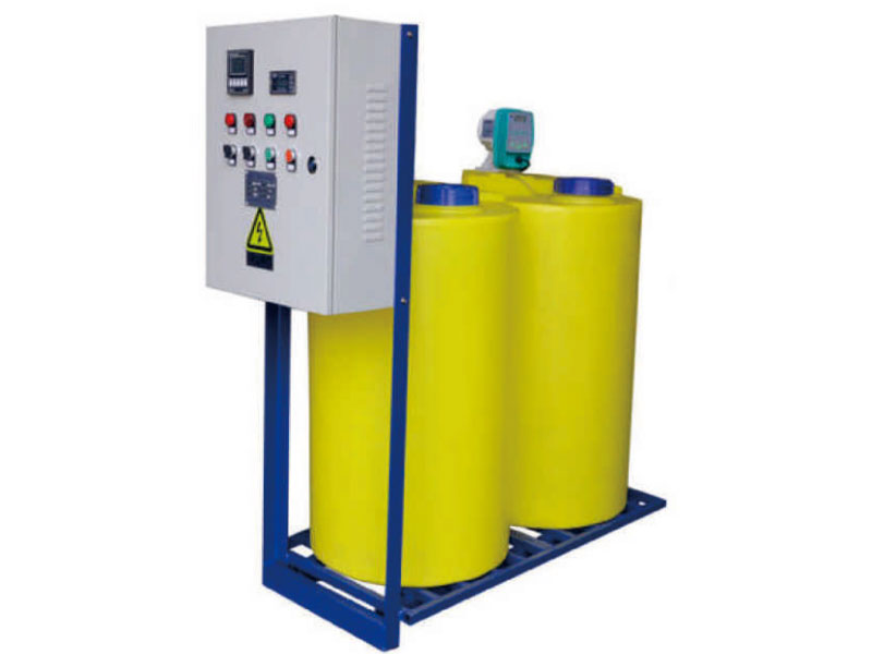 按需要將定量的藥劑放入攪拌溶液箱內進行攪拌溶解,溶解完畢后再通過計量泵送至投加點的工作過程,加藥量的大小可自由任意調節(jié),以滿足不同加藥量的場所。